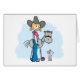 Cowgirl en jean avec bandana rose et chat debout à côté de son cheval bâton.