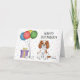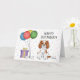 Design à thème d'anniversaire mignon avec le dessin original de Destei illustrant une jolie couleur blenheim Cavalier King Charles Spaniel race dog. A côté du chien il y a des ballons colorés d'anniversaire attachés sur un os de chien et une boîte cadeau de couleur violet et jaune. L'arrière - plan a un motif ludique de confettis pastel colorés sur un arrière - plan blanc. Il y a aussi une zone de texte personnalisable qui se lit maintenant : "Joyeux anniversaire !".