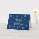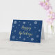 Une carte de vacances moderne et intemporelle ! Joyeuses fêtes en élégante typographie or. Des flocons de neige blancs et dorés. Arrière - plan bleu foncé. L'intérieur de la carte est entièrement personnalisable. Ajoutez les noms de votre famille et changez même les souhaits de vacances à l'intérieur de la carte si vous le souhaitez. Le texte à l'intérieur est "Je vous souhaite le meilleur de la saison. Joyeuses fêtes !" "de<your family's names>"