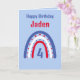 Carte Anniversaire Boho Rainbow avec l'âge et le nom et un verset à l'intérieur, peut être personnalisé en cliquant sur le bouton "personnaliser". Carte mignonne en blanc rouge et bleu sur un arrière - plan bleu pâle.