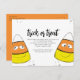 Une carte postale Halloween tendance et élégante à petit budget. Avec un code QR comportant une carte et une icône d'itinéraire. Friandise ou farce avec ces bonbons en forme de maïs d'Halloween mignons, drôles et fantaisistes. Ces adorables petits bonbons en forme de maïs sont heureux et prêts à ajouter de l'amusement à vos festivités d'Halloween. Des bonbons orange, jaune et noir fantaisistes avec des yeux souriants dessinés et des visages souriants sont mignons et peuvent être personnalisés à votre goût. Ce design présente une fête d'Halloween avec des bonbons en forme de maïs fantaisistes et mignons d'octobre, une typographie minimaliste simple, orange noir jaune, octobre Halloween simple, déguisement d'Halloween pour enfants adultes en famille, invitation à une fête d'anniversaire Halloween, visage drôle et idiot amusant, invitations à une fête d'Halloween, laura lacina
