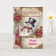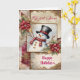 Cette carte de vacances présente un bonhomme de neige portant un haut-de-forme noir et une écharpe rouge, comme élément principal sur une page de junk journal. Des fleurs, des flocons de neige et des dentelles dorées, avec du texte, complètent la page. Très beau et festif !