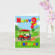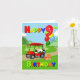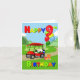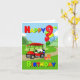 Zoom sur la scène d'anniversaire, une voiturette de golf rouge vif apporte excitation et joie! A l'avant se trouve un gâteau festif sur le thème du golf, tandis que le dos est empilé de cadeaux colorés et de ballons surmontés d'un ballon géant numéro 9. Avec un texte en gras de couleur primaire, cette carte est parfaite pour célébrer la journée spéciale d’un petit garçon.