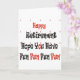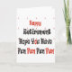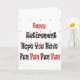 Carte de voeux pour une personne qui va se retirer. Happy Retirement Hope you have Fun" Lettres noires et rouges.