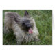 un petit terrier cairn brindé dans l'herbe avec la langue pendante