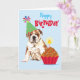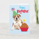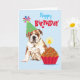 Joyeux salutations d'anniversaire avec ce design mignon avec un chiot Bulldog avec un cupcake et souriant, porté par un casquette de fête. Le texte peut être facilement changé; il suffit de cliquer sur le bouton personnaliser.