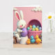 Designed with an ivory-toned bunny character at the center, this pastel scene shows it perched on a small wooden stool, cheeks softly blushed and ears lined in pink as it carefully decorates a shiny purple egg 🐰. The bunny wears a light tunic covered in tiny dots, and its focused pose feels like a quiet, affectionate moment shared with anyone watching. To the side sits a large basket in deep pink, filled with smooth eggs in yellow, blue, green, and gentle gray, each decorated with stripes, dots, or speckles. Along the bottom, a little group of rounded chicks in bright yellow, calm blue, and soft gray huddle close together, tilting their heads upward as if admiring the bunny’s careful work 🐇. The lighting is soft and even, with faint shadows under the stool and basket that give the figures a cozy, close-at-hand look. The greeting appears near the top in a light purple color, with smaller text placed beneath it in a matching tone. Behind everything is a pale pink background dotted with small, puffy white cloud shapes.