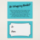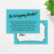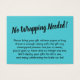 Si vous avez une douche d'affichage sans cadeau pour une future mariée, cette carte simple et amusante pourrait être le choix pour vous. À l'aide d'une police de script élégante, j'ai d'abord ajouté un en-tête qui dit "Pas de Wrapping requis!" sur le devant, et "À" et "De" pour le côté de la balise cadeau. Le champ modèle a été mis en place pour offrir des instructions aux clients qui ne mettent pas leur présent dans leur enveloppe. N'hésitez pas à modifier le libellé de la façon que vous souhaitez. Il y a beaucoup d'alternatives populaires à ce texte, si vous voulez un changement. Toutes les polices et les couleurs peuvent être modifiées à votre gré.