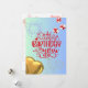 Avant : La carte a un arrière - plan bleu clair. Au centre se trouve un grand texte rouge qui dit "Joyeux anniversaire à vous", décoré d'étoiles blanches et rouges. Au-dessus du texte, il y a deux feux d'artifice blancs, et dispersés autour sont de petites étoiles. A droite, il y a deux boîtes-cadeaux avec des rubans rouges, et en bas à gauche, il y a un ballon en forme de coeur doré. Retour : Il y a une boîte à cadeaux et un ours en peluche à imprimer de manière légère, ainsi que les expressions "nous vous souhaitons le meilleur" et "faites un voeu et fêtez votre journée spéciale" dans une police élégante.