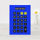 Calculatrice bleue avec texte d'anniversaire heureux et boutons du clavier noir. Le texte à l'écran peut être modifié ou supprimé.