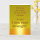 Achetez une carte de voeux pour un ami malade. Votre ami vit-il avec la maladie chronique ? Une carte bonne d'obtention est-elle inappropriée parce qu'elles vivent avec grave, le long terme ou même la maladie incurable ? Voulez-vous que lise-t-elle des mots d'encouragement ? Laissez cette carte puissante d'amitié communiquer votre admiration. Alternativement, achat comme carte pour un enfant de mêmes parents malade, parent ou enfant. Les mots sur l'avant de la carte sont "lui prend la force pour vivre avec la maladie. Je vois votre force". L'intérieur de message que ceci obtiennent la carte bonne lit "avec mon admiration". Alternativement vous pouvez customiser la carte. Par exemple, vous pourriez changer le message à l'intérieur pour lui faire une carte de joyeux anniversaire pour un ami malade. Il est également approprié à un ami vivant avec l'examen médical ou la maladie mentale. Si vous souhaitez envoyer la carte directe, ajoutez le nom du destinataire et de votre propre nom. Supprimez alternativement ces options et les stockez sur les cartes vierges. Je vis avec l'encéphalomyélite myalgique ME/CFS. Il est facile d'égaliser la faiblesse physique avec la faiblesse générale et je trouve cette carte encourageant ainsi. L'image a une suggestion d'or et la lumière et la carte est disponible d'une qualité de papier plus de petite taille et différente. Si vous la voulez dans une plus grande taille, obtenez svp dans le contact.