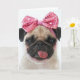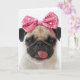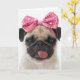 Chien Carlin avec la langue avec un ruban rose paillé, arrière - plan blanc.