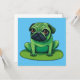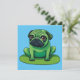 Carlin vert mignon ressemblant à une grenouille assise sur un lilipad. La couleur Arrière - plan peut être modifiée.