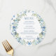 Laissez-vous tenter par l'élégance vibrante de notre carte de menu mariage de printemps/été rustique et fantaisiste. Décoré d'une couronne de délicate couronne d'aquarelle bleue florale, il ajoute une touche parfaite pour rehausser votre expérience culinaire.
