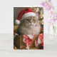 A fluffy cat wearing a Santa hat relaxes in a torn-open gift box, surrounded by a softly blurred backdrop of festive lights that enhance the holiday spirit.