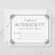 Élégant certificat d'authenticité carte plate en gris foncé et blanc à laquelle vous pouvez ajouter votre nom ou nom d'entreprise dans un cadre orné d'inspiration vintage. Certificat blanc d'authenticité carte plate avec cadres et polices élégantes.