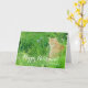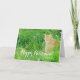 Une carte heureuse de retraite avec un chat de gingembre dormant dans un pré entouré par la longues herbe et jacinthes des bois.