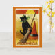 Carte de voeux Halloween vintage illustration montrant un chat noir, balai sorcier et casquette avec le texte "Friendly Fairy Witch or Fay, remplir le souhait que vous souhaitez aujourd'hui."