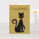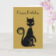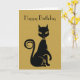 Chat noir élégant posant avec une patte levée. A une queue bouclée mignonne et porte un collier fantaisie. Message de Joyeux Anniversaire avec un vœu d'anniversaire sympathique à l'intérieur.