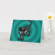 Une carte de voeux noire avec un chat en noir et blanc avec 2 paires de roller, des chaussettes rayées en noir et blanc et un casque de sécurité.