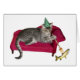 Un chaton à soupe doux portant un casquette de fête s'allonge sur un canapé avec une fourchette de poissons. Faites sourire les gens quand vous envoyez cette carte bizarre.