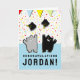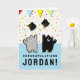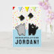 Carte de graduation mignonne avec des chats de dessins animés jetant des casquettes en l'air.