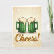 This greeting card shows two emerald-green beer mugs centered on a soft beige background, tilted slightly toward each other like close friends leaning in for a toast 💚. Each mug is filled to the top with creamy white foam that spills gently over the rim, adding a cozy, just-poured look. The glass bodies have neat vertical grooves that catch the light and give them a textured, polished feel. They sit side by side with a balanced, mirror-like layout that makes the clink feel shared and affectionate ☘️. Beneath the mugs, the word “Cheers!” is placed near the bottom in burnished gold lettering that curves smoothly across the space. A soft, diffused glow washes over the scene, with faint bokeh dots floating in the background like distant party lights. The foam is bright white with rounded edges, and the gold “Cheers!” sits clearly below the mugs against the warm beige field.