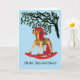 Photo de cheval rocking en bois, à crinière rouge et rockers, assis sous les branches de l'arbre. "Ride 'Em Cowboy" sur le devant, et "Joyeux anniversaire" à l'intérieur peuvent être changés.