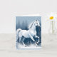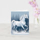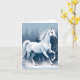 "Le cheval blanc magique d'hiver" représente un cheval blanc courant dans la neige dans une forêt hivernale bleue.