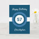 Une carte bleue personnalisée de 57ème anniversaire pour lui, que vous pouvez facilement personnaliser avec l'âge dont vous avez besoin avec son nom sur le devant de la carte. Vous pouvez facilement personnaliser le message de la carte intérieure si vous le souhaitez. Cette carte personnalisée de 57ème anniversaire ferait un grand souvenir pour lui.