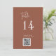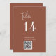 Ce numéro de table de code QR chic et moderne en terre cuite est parfait pour un mariage simple. Le design boho du désert présente une typographie bohème rustique unique et élégante, dans une couleur de rouille orangée brûlée. La carte s'imprime à l'avant et à l'arrière (double face). Utilisez le code à barres pour accéder à votre menu, à un site Web ou à un média social où vos invités peuvent partager des photos. Ajoutez chaque numéro de table dont vous avez besoin à votre panier individuellement.