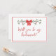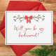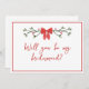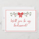 Célébrez la saison de l'amour et de la joie avec cette carte de voeux festive sur le thème de Noël ! Doté d'un arc rouge charmant, de délicats accents de verdure et d'une police de script élégante, cette carte combine magnifiquement la joie des vacances avec l'excitation de votre journée spéciale. Parfait pour demander à vos servantes de se tenir à vos côtés dans le style, ce design est personnalisable et ajoute une touche de magie de vacances à vos plans mariages. Idéal pour les mariages de Noël ou les fêtes de mariée d'hiver, cette carte rendra votre moment de proposition inoubliable.