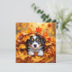 Carte pour notes d'automne saisonnier avec un dos vierge. Un doux petit chien chiot jouant dans une pile de feuilles d'automne. Il regarde adorablement tandis qu'il se cache dans la pile de feuilles.