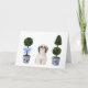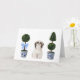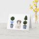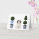Cette carte de voeux présente un portrait aquarelle d'un mignon chien tzu shih assis entre deux topiaires de style chinoiserie.