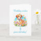 Carte de 6e anniversaire pour un enfant qui aime son chien chiot. Un mignon chiot souriant pour dire heureux 6ème anniversaire. Un chiot marron avec des fleurs et des papillons envoyant des voeux d'anniversaire.
