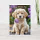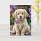 Un chiot de récupération d'or se tient doucement, tenant dans la bouche une branche de fleurs violettes. Tout le texte peut être modifié.
