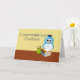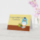 Félicitez le diplômé d'un joli hibou de dessin animé avec des plumes bleues avec un casquette et un diplôme. Il est assis sur une pile de livres et a un porte-crayon à côté de lui. Vous pouvez modifier le texte intérieur.