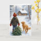 A young boy carries a small evergreen tree as he walks through a snowy forest with his golden retriever, heading toward a warmly lit cabin that enhances the serene winter scene.
