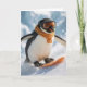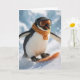 A penguin wearing goggles and an orange scarf is snowboarding down a snowy slope.