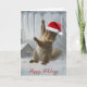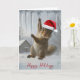 A cute squirrel, wearing a festive Santa hat, playfully hangs from an icicle as it curiously peeks through a window.