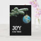 "Joy to the World" text with globe ornament hangs from a snowy pine tree branch, illuminated against a black night sky filled with shimmering stars.