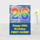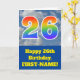 L'avant de cette amusante carte de voeux de 26ème anniversaire présente une représentation d'un ciel bleu avec des nuages, ainsi que le numéro "26" ayant un spectre arc-en-ciel multicolore comme un motif dégradé. L'avant comporte également un message d'anniversaire, y compris un nom de destinataire customisé. L'intérieur comporte un message de voeux d'anniversaire personnalisé, ou peut-être pourrait-il être effacé et laissé vide si un message doit être écrit à la main à la place. Une carte d’anniversaire personnalisée comme celle-ci pourrait être une façon amusante de souligner le vingt-sixième anniversaire de quelqu’un. [~Z0000370]