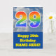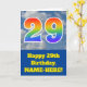 L'avant de cette amusante carte de voeux de 29ème anniversaire dispose d'une représentation d'un ciel bleu nuageux, avec le numéro "29" ayant un spectre arc-en-ciel multicolore comme un dégradé look. L'avant comporte également un message de voeux d'anniversaire, y compris un nom de destinataire personnalisé. L'intérieur comporte un message de voeux d'anniversaire modifiable, ou peut-être pourrait-il être effacé et laissé vide si un message doit être écrit à la main à la place. Une carte d'anniversaire personnalisée comme celle-ci pourrait être une façon amusante d'envoyer des voeux d'anniversaire à quelqu'un qui célèbre son vingt-neuvième anniversaire. [~Z0000370]
