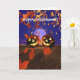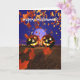 Carte de voeux avec mon oeuvre originale de deux citrouilles riants la nuit d'Halloween avec une pleine lune et des feuilles d'automne. "Happy Halloween" sur le devant et mon verset personnalisable à l'intérieur.