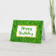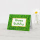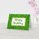 Une carte de voeux d'anniversaire personnalisée avec votre propre message ou laisser le message à l'intérieur tel quel. Conçu avec une belle conception printanière montrant un champ de feuilles de trèfle dans un vert naturel luxuriant. Joyeux anniversaire, dans une police tendance, écrit au centre sur un cadre blanc avec une bordure en feuille d'or FAUX.