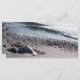 Close up photo of a little wave hitting the beach over seaweed and sand. Out of focus stones in the forground.