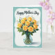 This card features an illustrated bouquet of sunny yellow roses arranged closely together like a caring hug ❤️. Soft green leaves and tiny white filler flowers weave between the blooms, adding a gentle, friendly closeness to the scene. The flowers sit in a clear glass vase with water, and the green stems show through the glass for a natural, down-to-earth touch. A soft, cloud-shaped white border frames the bouquet and separates it from a muted teal background that feels calm and steady. Centered near the top, the text reads “Happy Mother’s Day” in dark lettering that stands out clearly against the lighter space. The lighting looks soft and warm, catching small highlights on the vase and subtle shading along the rose petals 🌼. The white border has rounded, softly uneven edges against the teal background.