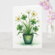 This card shows a potted clover plant painted in soft watercolor tones, set against a bright white background that keeps everything airy and focused. A full cluster of green leaves fills the center, with several four-leaf clovers tucked among small white five-petal flowers that lean toward each other like close friends. The blossoms have tiny golden-yellow centers that add warmth, and the stems curve gently as if sharing space in a quiet, affectionate way 💚. The pot sits at the bottom in deep green with subtle shading, grounding the plant while the lighter greens above feel fresh and light. Near the base, small shamrock shapes and loose green paint flecks scatter outward, giving the scene a casual, breezy motion ☘️. There’s no large headline across the top, keeping the artwork as the main focus, while any greeting text would sit neatly below the pot in a matching green. Tiny shamrock silhouettes and soft green splatters drift across the lower background, especially around the pot’s base and along the bottom edge for extra detail.