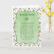 Cette carte de St Patrick's Day présente la Bénédiction irlandaise entourée d'une bordure de trèfle violet. Sur le côté droit se trouve la Bénédiction irlandaise "Puisse la route se lever pour vous rencontrer. Que le vent soit toujours à votre dos. Que le soleil brille sur votre visage, et que les pluies tombent douces sur vos champs. Et jusqu'à ce que nous nous rencontrions, que Dieu vous tienne dans la paume de Sa main." À l'intérieur de la carte se trouve un motif de trèfle qui se coordonne avec l'avant.