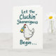 This card shows a plump white cartoon chicken centered on a white background, outlined in black with a red comb and wattle, holding a pale blue bottle with a golden-yellow label tucked under its wing. The chicken’s slight head tilt and sideways glance suggest it’s sharing a private joke with someone close, like a friend leaning in before a toast 💚. Curved teal text sits above the character reading, “Let the Cluckin’ Shenanigans Begin...,” with matching teal lettering arcing below to frame the scene. The rounded lettering stands out crisply against the white space, keeping your eyes on the chicken and its cheeky prop ☘️. Simple shading and minimal details give the bird an easygoing, cartoon look, while the bottle adds a wink of celebration. The open background leaves plenty of breathing room, making the central figure feel like it’s stepping forward to include the viewer in on the fun. The bottle’s pale azure body and bright yellow label sit snugly beneath the chicken’s wing at the center of the design.
